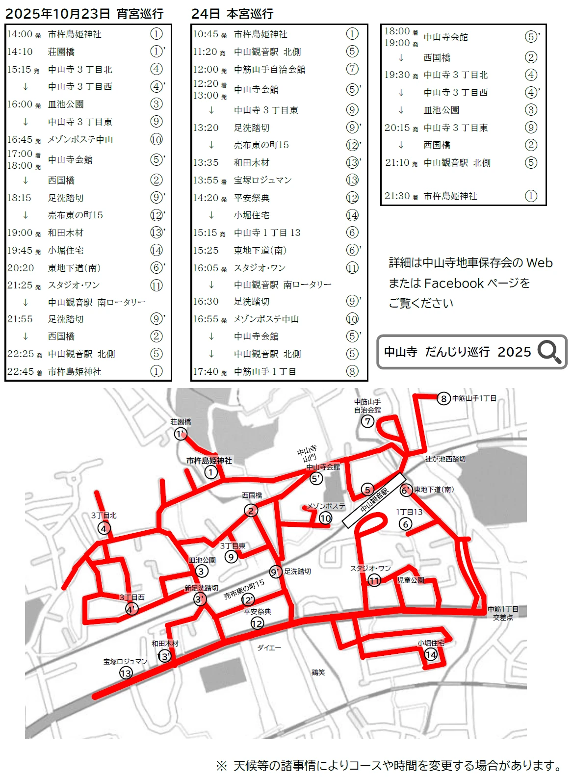 2025年(令和7年)市杵島姫神社秋季大祭に合わせて行われる中山寺地区だんじり巡行スケジュールを公開。